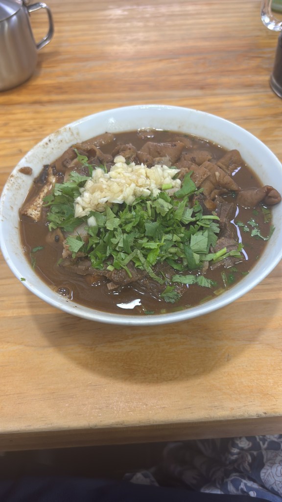 China really hits differently – what a day, what a trip. First stop of the day I directly wanted to try a classic, old Beijing dish: Lu zhu. Never heard of? If you are vegan, vegetarian or have an issue with giblets I recommend to stop reading here. Still here? Welcome to the world of Lu zhu. The key ingredients are pork, pork lung, pork intestines, pork liver, tofu and some may add fermented bean curd and it is served with bing bread. The whole meal is topped with garlic and coriander. Even though I grew up in upper Franconia (coming home always includes a welcome black pudding bread, thanks mum) and have a hunting background I was sceptical.